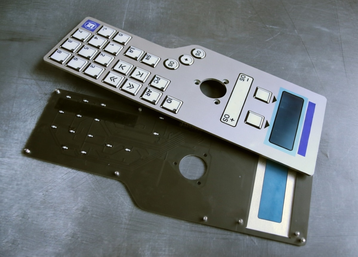 Пленочные клавиатуры на металлическом основании представляют собой многослойную мембранную панель, нанесенную на жесткую металлическую плиту. В качестве основания чаще всего используется алюминий или сталь, которые могут быть обработаны фрезеровкой, штамповкой или лазерной резкой. При необходимости основание оснащается отверстиями, зенковками, обнизками и метизами для удобного монтажа. Сверху на основание наклеивается пленочная мембрана с контактными слоями и высококачественной графикой. Мы предлагаем различные варианты толщины металла, типы покрытий (анодирование, порошковая покраска, никелирование, хромирование и другие) и степень защиты от IP54 до IP67.